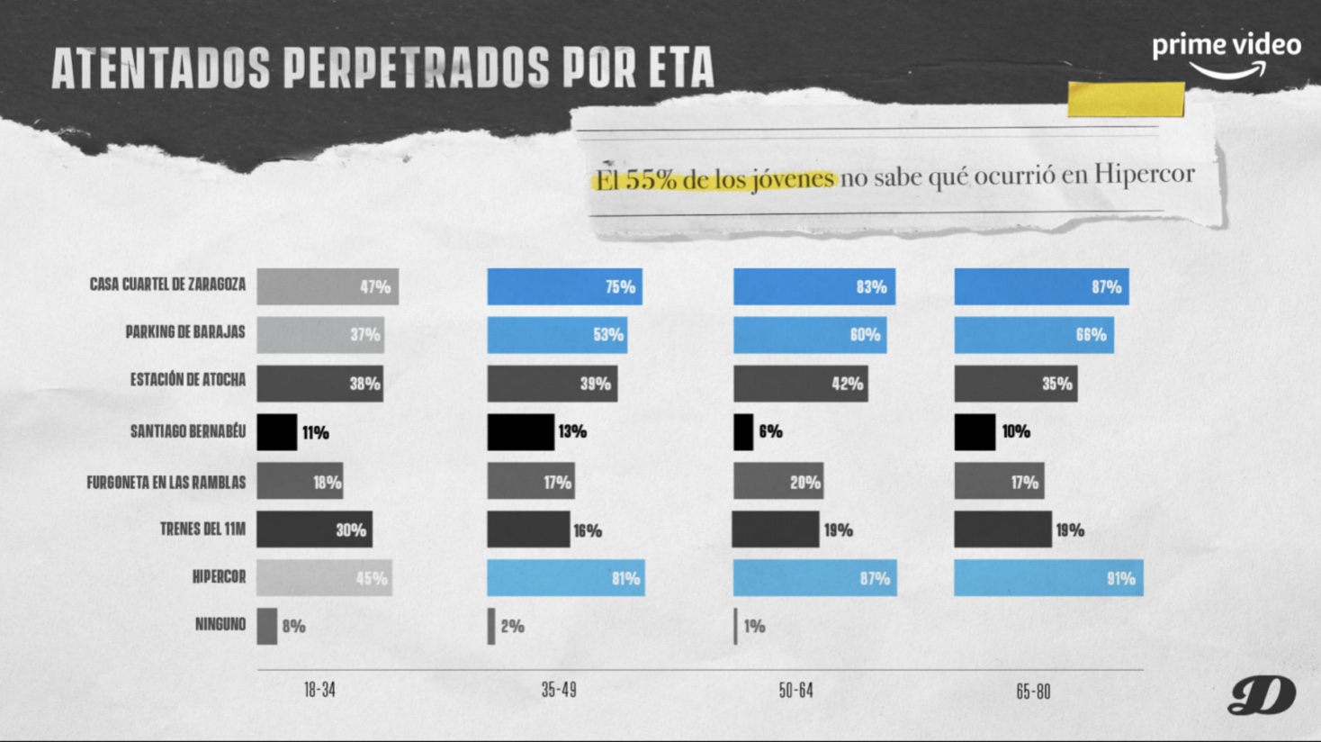 Una gran parte identifica los atentados de ETA como de Hipercor (75,8%) -a pesar de que un 55% de los jóvenes desconoce lo que sucedió- y el del cuartel de Zaragoza (72,7%), mientras que un 53,2% recuerda que también perpetraron la explosión de la T4 del aeropuerto de Barajas (Madrid). Sin embargo, otros señalan a la banda terrorista como los causantes del 11-M (20,7%) y Las Ramblas (18%) -ambas provocadas por el terrorismo yihadista-.
