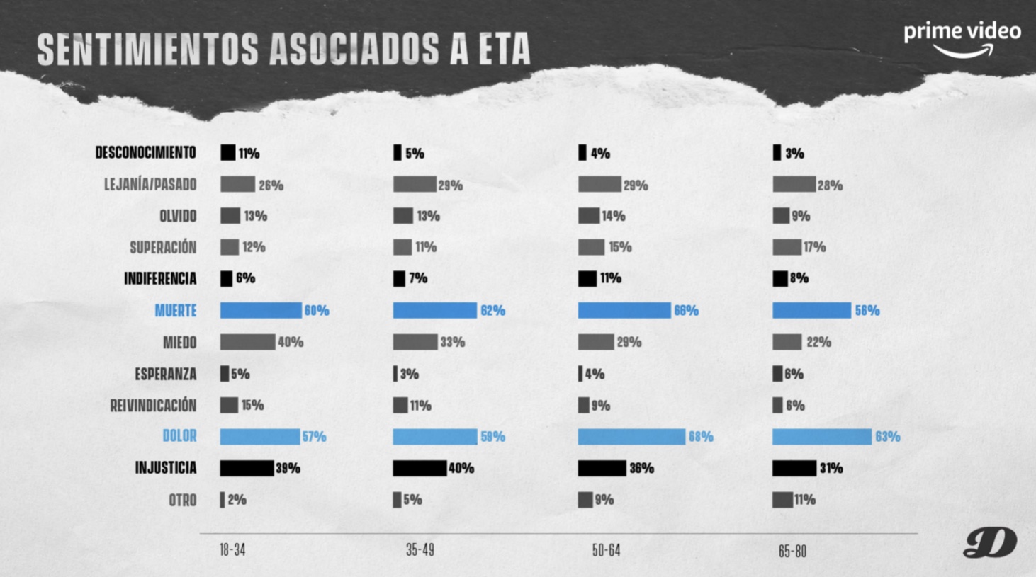 La mayoría asocia las palabras muerte y dolor como sentimientos de la actualidad al mencionar a la banda terrorista. Ante la pregunta de la actividad de ETA en el presente, menos de la mitad sabe que ha desaparecido, incluso un 16,7% señala que se encuentra en proceso de transformación. Y en cuanto a qué medio ha tenido más conocimiento sobre la actividad armada, los jóvenes han aprendido más en sus familias que en sus colegios y universidades y se han informado más a través de los medios de comunicación.